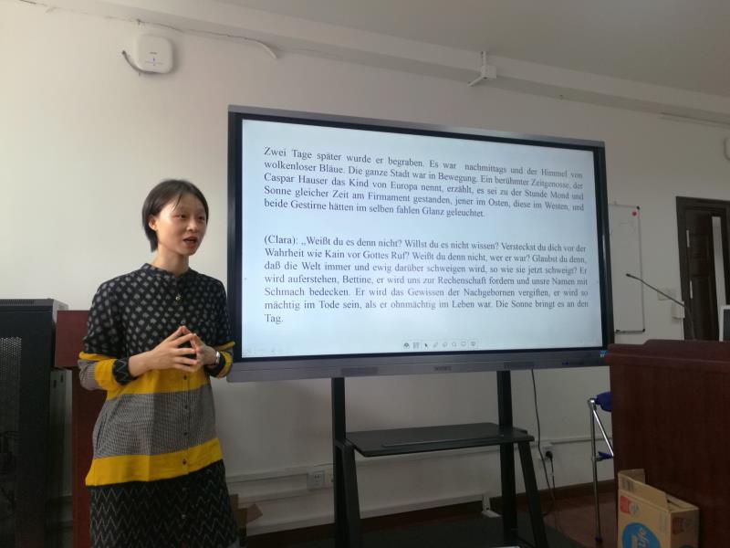 姜林静老师首先做了题为《卡斯帕·豪泽尔的文学神化》的主旨报告。学界一直热衷于研究卡斯帕·豪泽尔神秘的一生。一些学者将他比作殉道者,而另一些人则认为豪泽尔是一个彻头彻尾的骗子。姜林静老师借助格奥尔格·特拉克尔的《卡斯帕·豪泽尔之歌》、格雷戈·特里科尔以豪泽尔生平为背景创作的系列画作和沃纳·赫尔佐格导演的《卡斯帕·豪泽尔之谜》分析了卡斯帕·豪泽尔形象中的现代性,以及该形象与基督形象的异同。