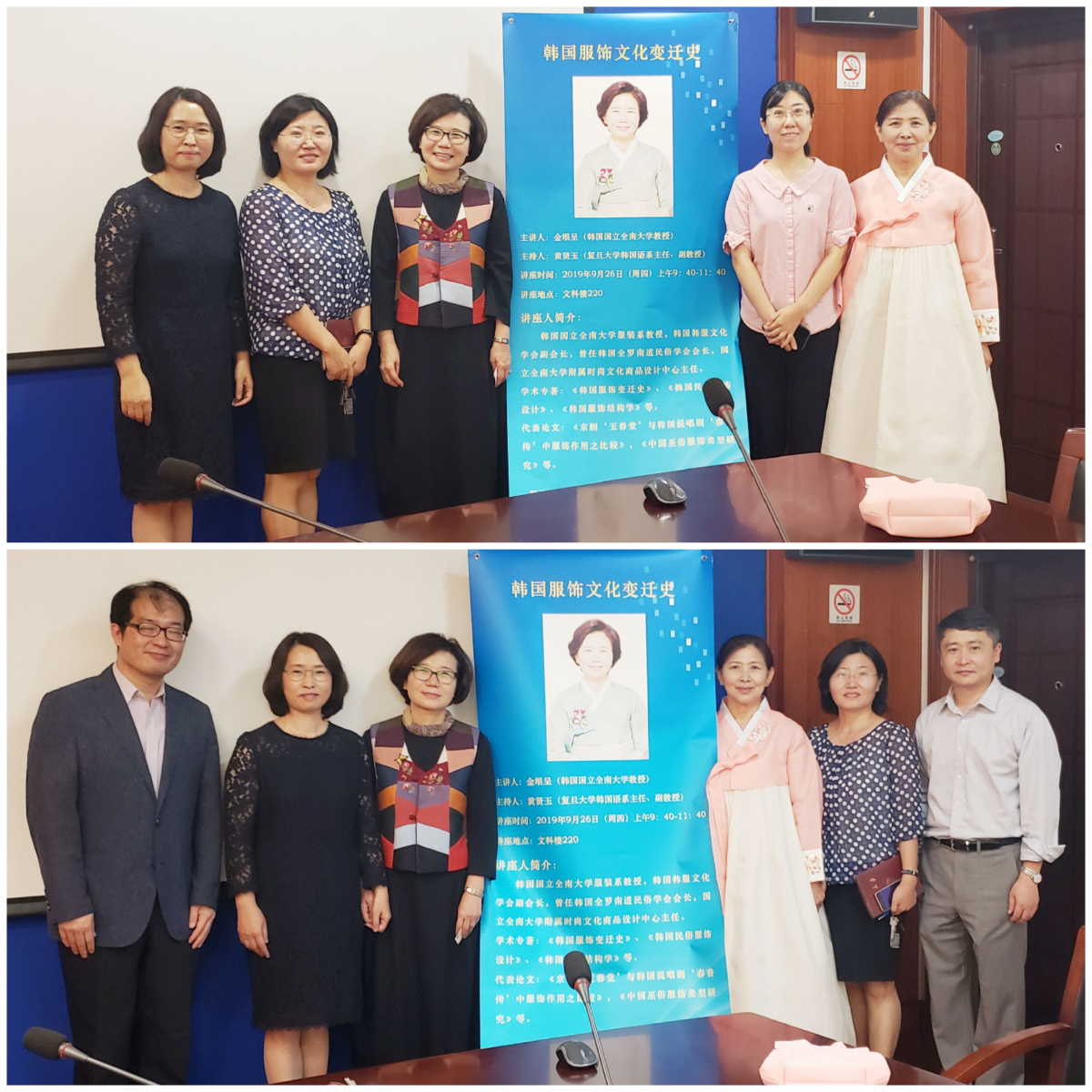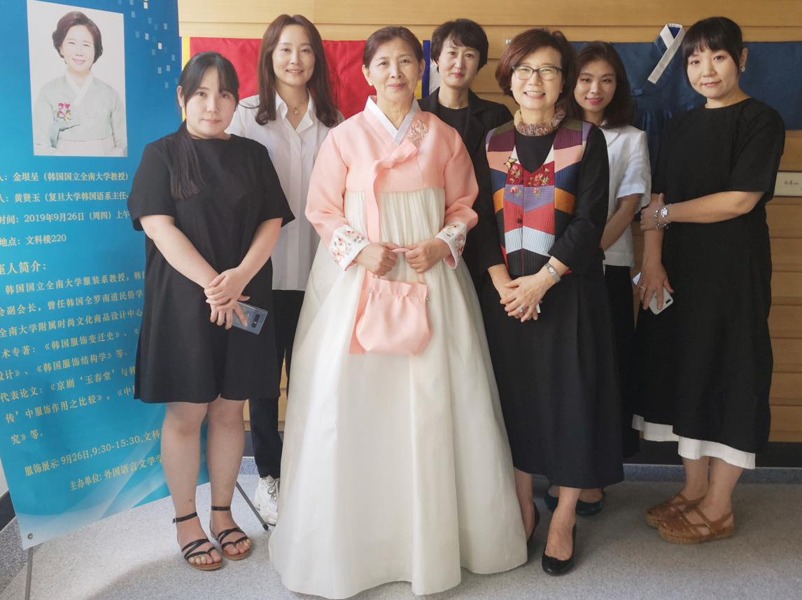 2019年9月26日,韩国国立全南大学教授金垠呈应邀前来 丝瓜 丝瓜 做了主题为“韩国服饰文化变迁史”的讲座,随行的五名博士生准备了精美的韩国服饰展,展示了韩国各历史时期的服装,从而让学生们更加近距离的接触了解韩服、体验韩国文化。