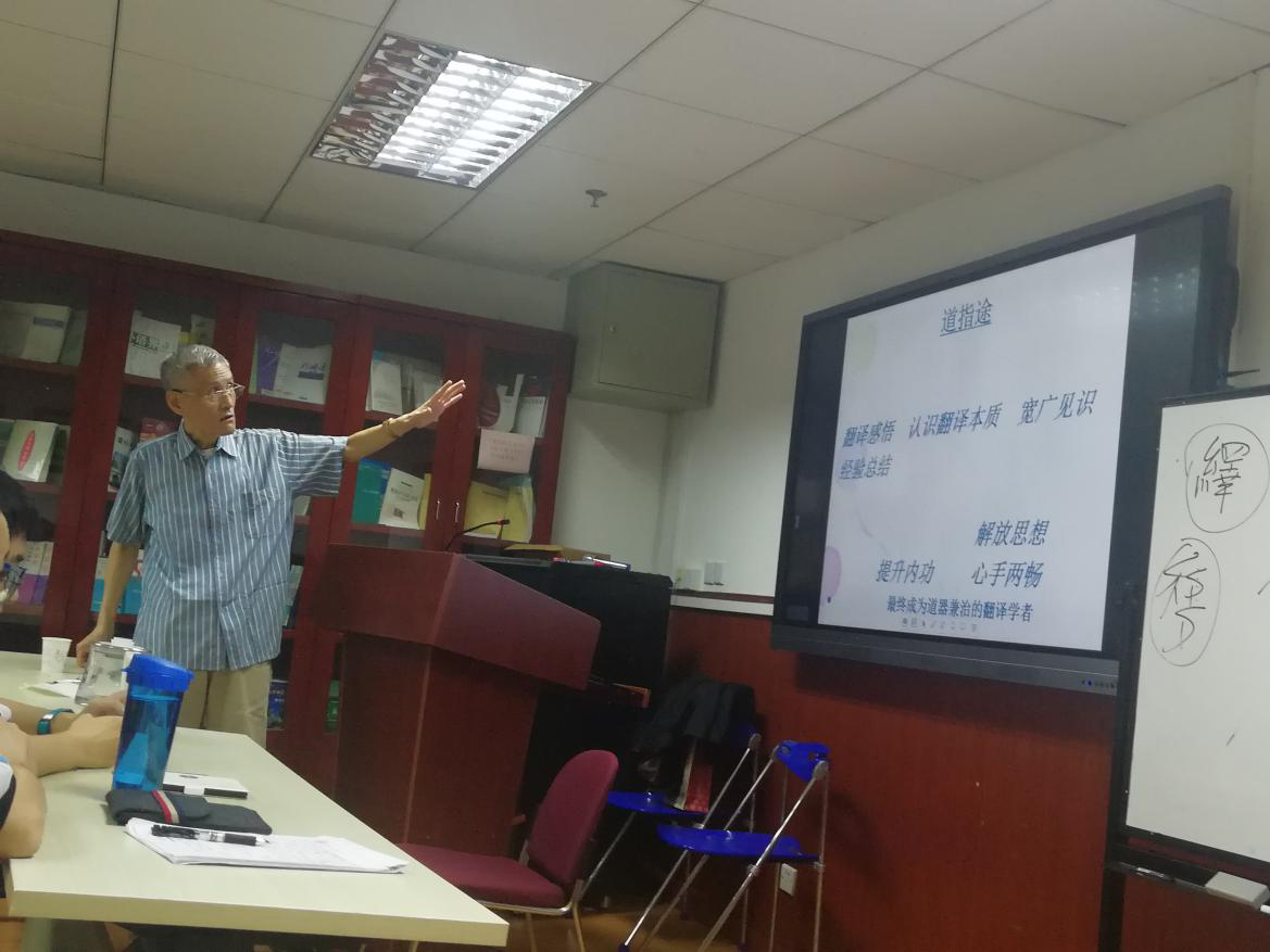 10月8日下午, 丝瓜 教授、博士生导师,翻译系创始系主任,现任上海市科技翻译学会理事长兼《上海翻译》主编,上海市翻译家协会理事何刚强教授莅临 丝瓜 丝瓜 ,以“翻译之道器简说”为主题讲述了 丝瓜 翻译系发展特点和翻译系师生学习方向,给翻译系师生们带来了一顿丰盛的精神盛宴。系主任陶友兰教授主持了本场讲座。