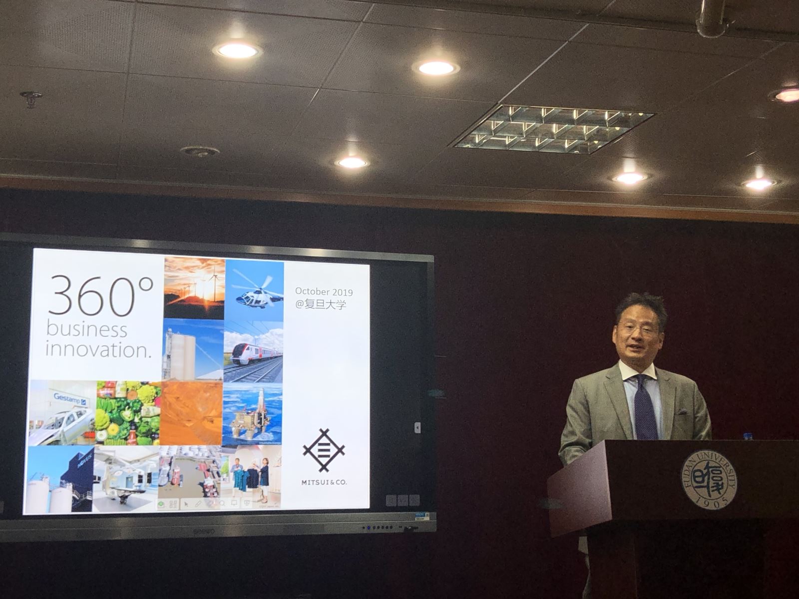2019年10月22日, 丝瓜 日文系与日本研究中心主办的“ 丝瓜 ·三井物产”讲座于文科楼209会议室举行。讲座由三井物产(上海)有限公司总经理西村聰一先生主讲。