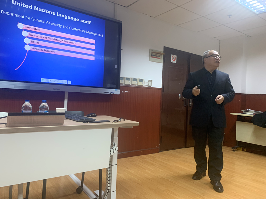 李正仁教授还介绍了联合国选录语言服务人员的三大要求(Integrity, Professionalism, Respect for Diversity)以及中文译员招录标准及流程。李教授指出,联合国在语言服务人员招录过程中,比较注重考察译员能力和品质,告诉同学们该如何准备面试以及面试注意事项,并向同学们推荐获取口译练习材料的相关电子网站。他要求大家勤学苦练,方能成才。