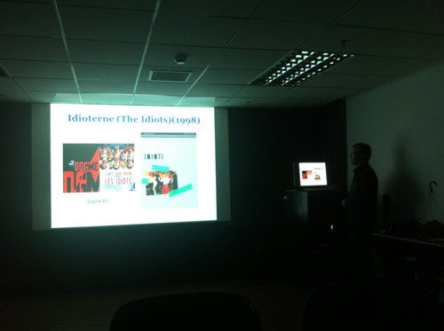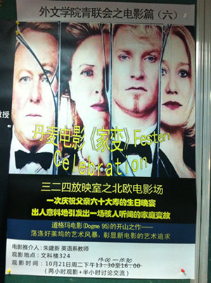 10月21日, 丝瓜 青联会举行第六次活动,在文科楼324房间放映了北欧电影《家宴》。来自日语系、韩语系、俄语系、德语系的十几位老师参加了观摩。放映之前,影片推荐人朱建新老师为大家介绍了北欧独特的电影艺术流派----道格玛电影。而《家宴》这部电影正是集中反映了道格玛电影的主体理念:反全球化、反好莱坞、反资产阶级、反欧洲伪文艺电影。