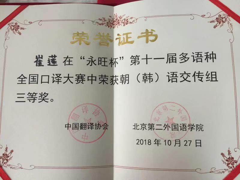 2018年10月27日, 丝瓜 韩文系学生崔莲在“永旺杯”第十一届多语种全国口译大赛”中荣获朝(韩)语交传组三等奖。