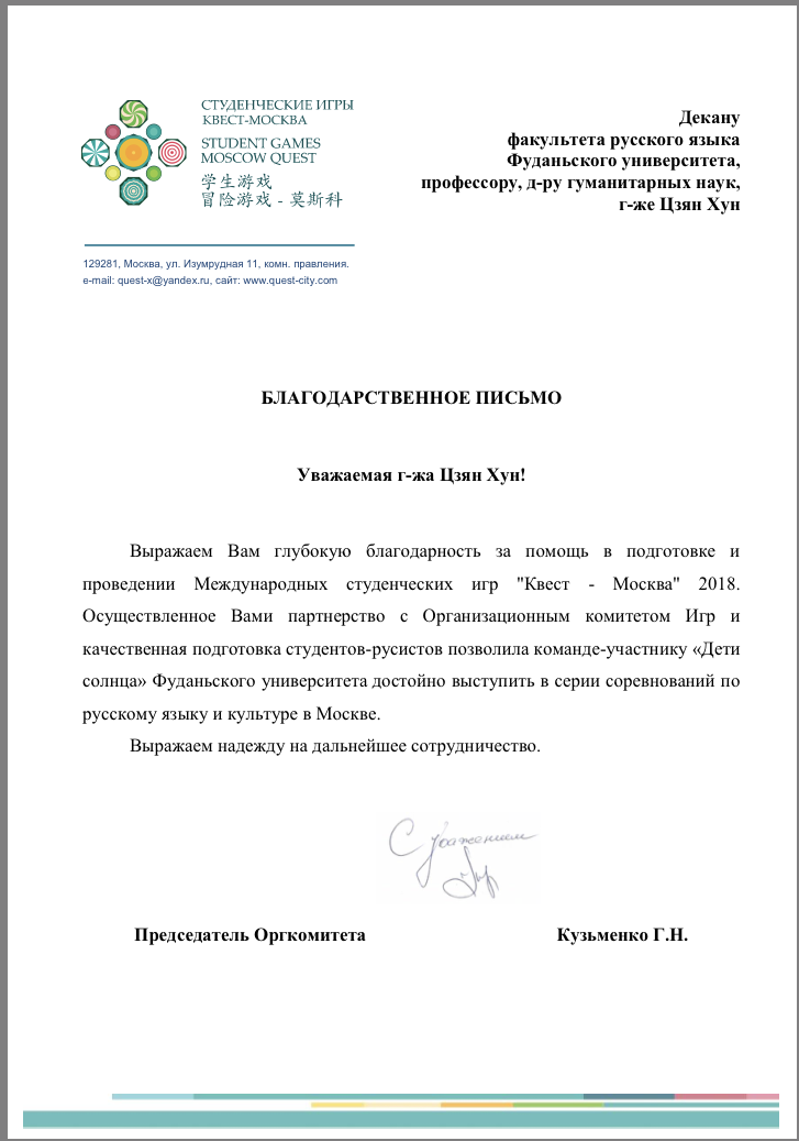 比赛结束后,大赛组委会发来贺信,祝贺俄文系代表队在本次比赛中喜获佳绩,同时感谢校方对本次比赛的支持。