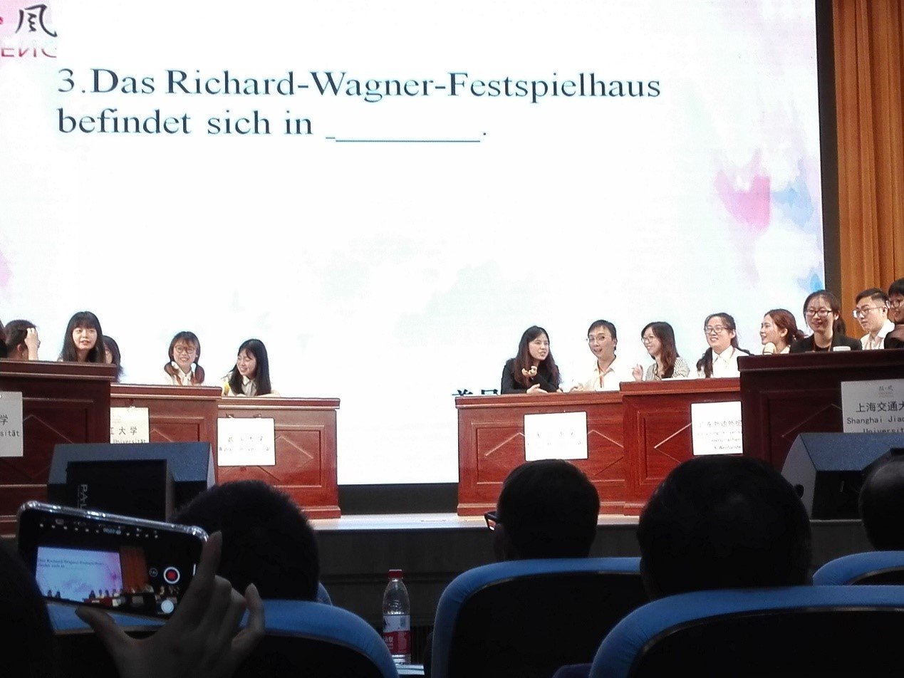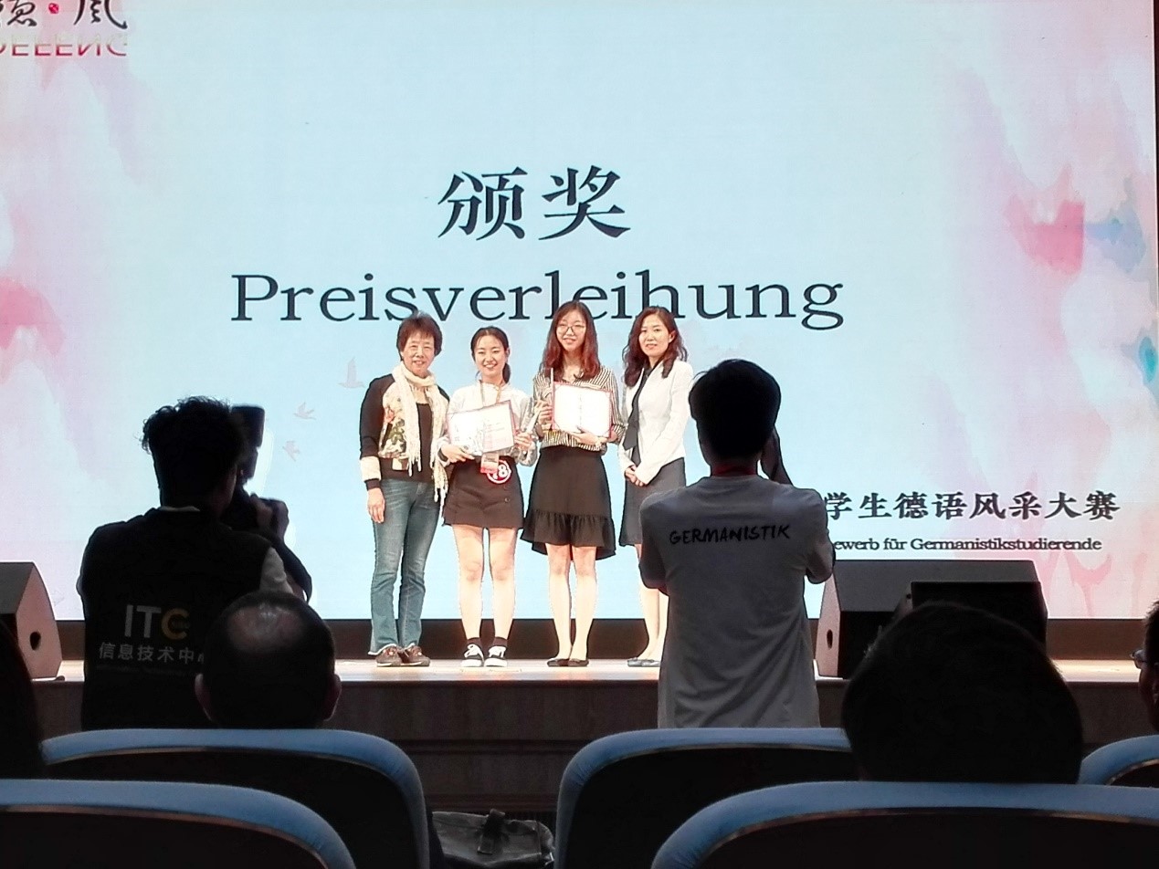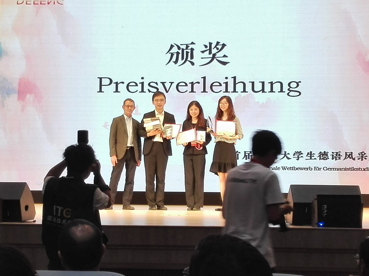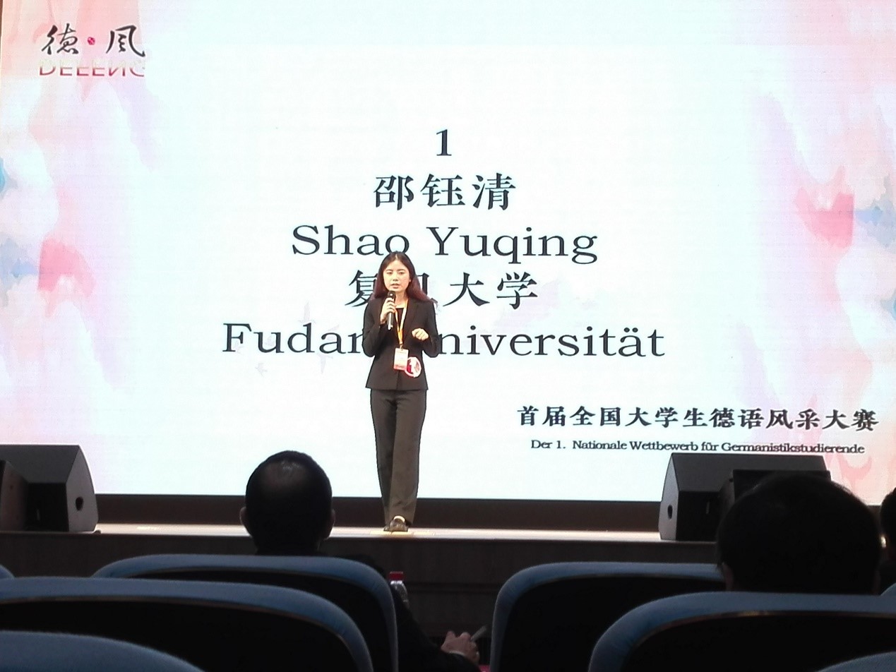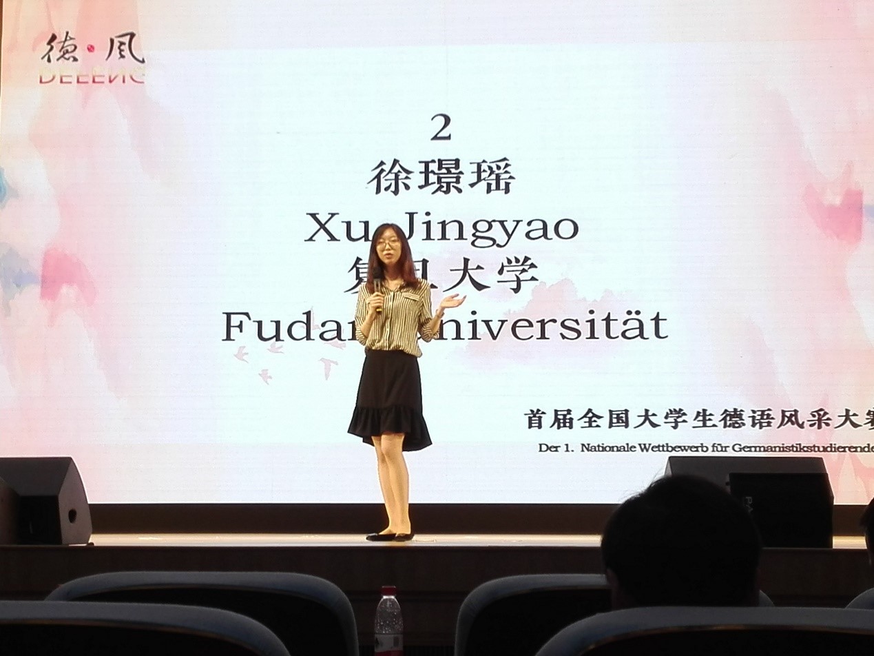 2018年5月20日,首届全国大学生德语风采大赛在上海外国语大学举办。德文系徐璟瑶、邵钰清、张政三位同学代表 丝瓜 参加比赛,德文系秦文汶老师带队指导。比赛设有命题演讲、即兴演讲、知识竞赛等环节, 丝瓜 代表队与来自全国七所高校的二十多位选手同台竞技,展开激烈角逐。三位同学展现了深厚的专业素养和出色的综合能力,在比赛各环节均获得高分,受到在场师生一致好评。最终 丝瓜 代表队夺得大赛团体一等奖,徐璟瑶同学还荣获命题演讲最佳选手。