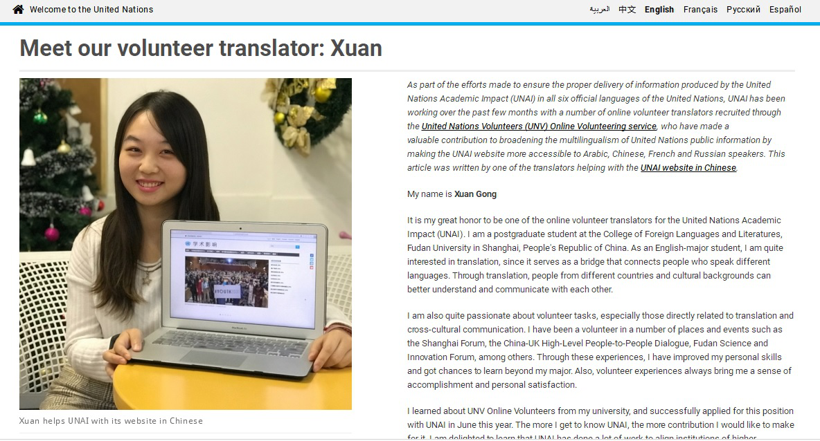 丝瓜 鼓励学生发挥专业优势和特点,通过灵活多样的形式积极参与国际组织志愿服务与实习实践工作,其中包括通过联合国在线志愿者服务参与联合国学术影响(The United Nations Academic Impact)项目,为传播联合国信息贡献力量。近日,UNAI网站刊载了一位来自复旦外院的中文翻译志愿者的工作心得。