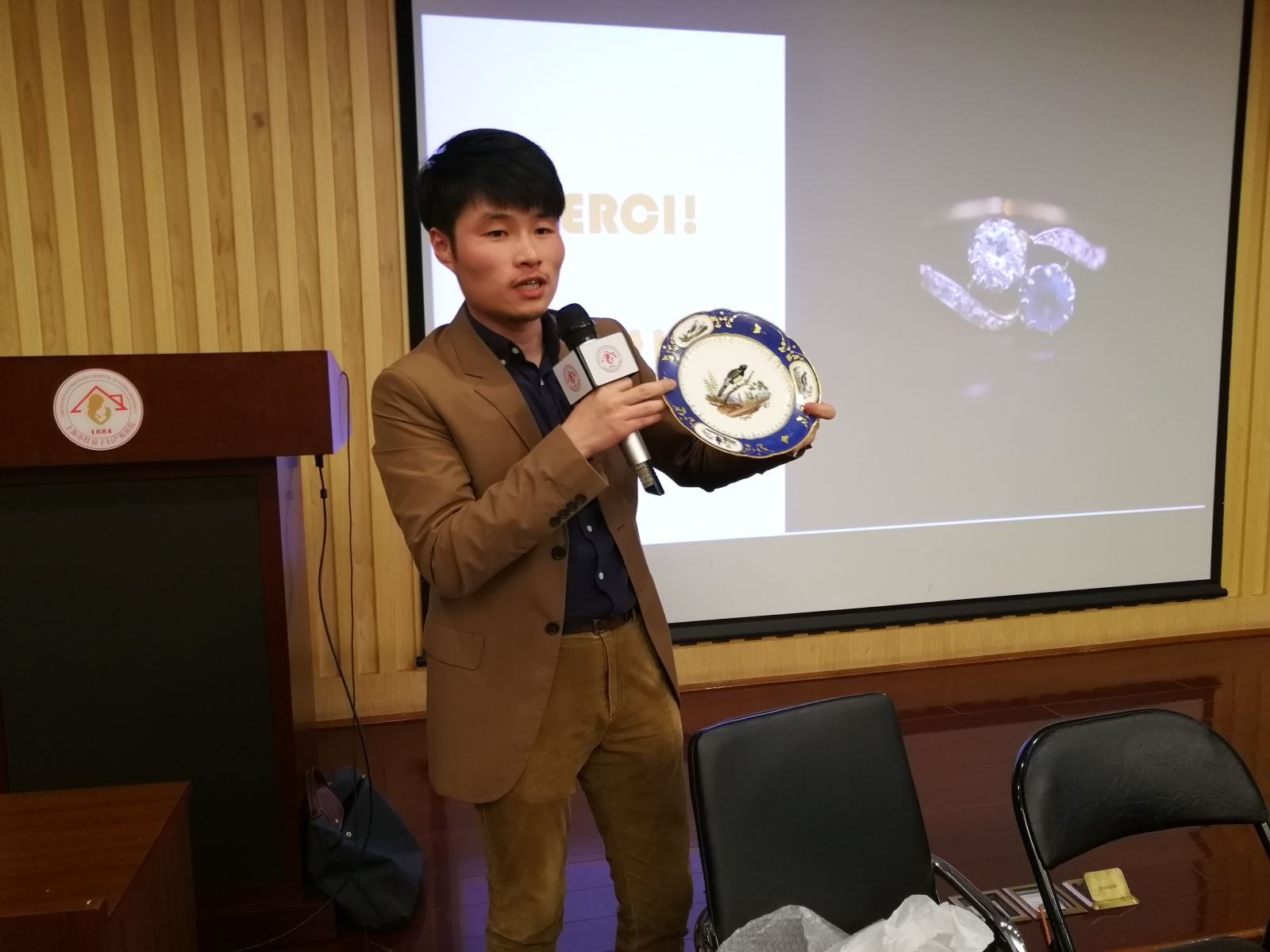 随后, 丝瓜 俄德法支部党员、法文系陈杰博士给大家带来了题为“古董珠宝收藏文化”的专题文化讲座。他深入浅出地介绍了法国珠宝鉴赏和收藏的基本知识,并与大家共同品鉴了自己收藏的法国瓷器。