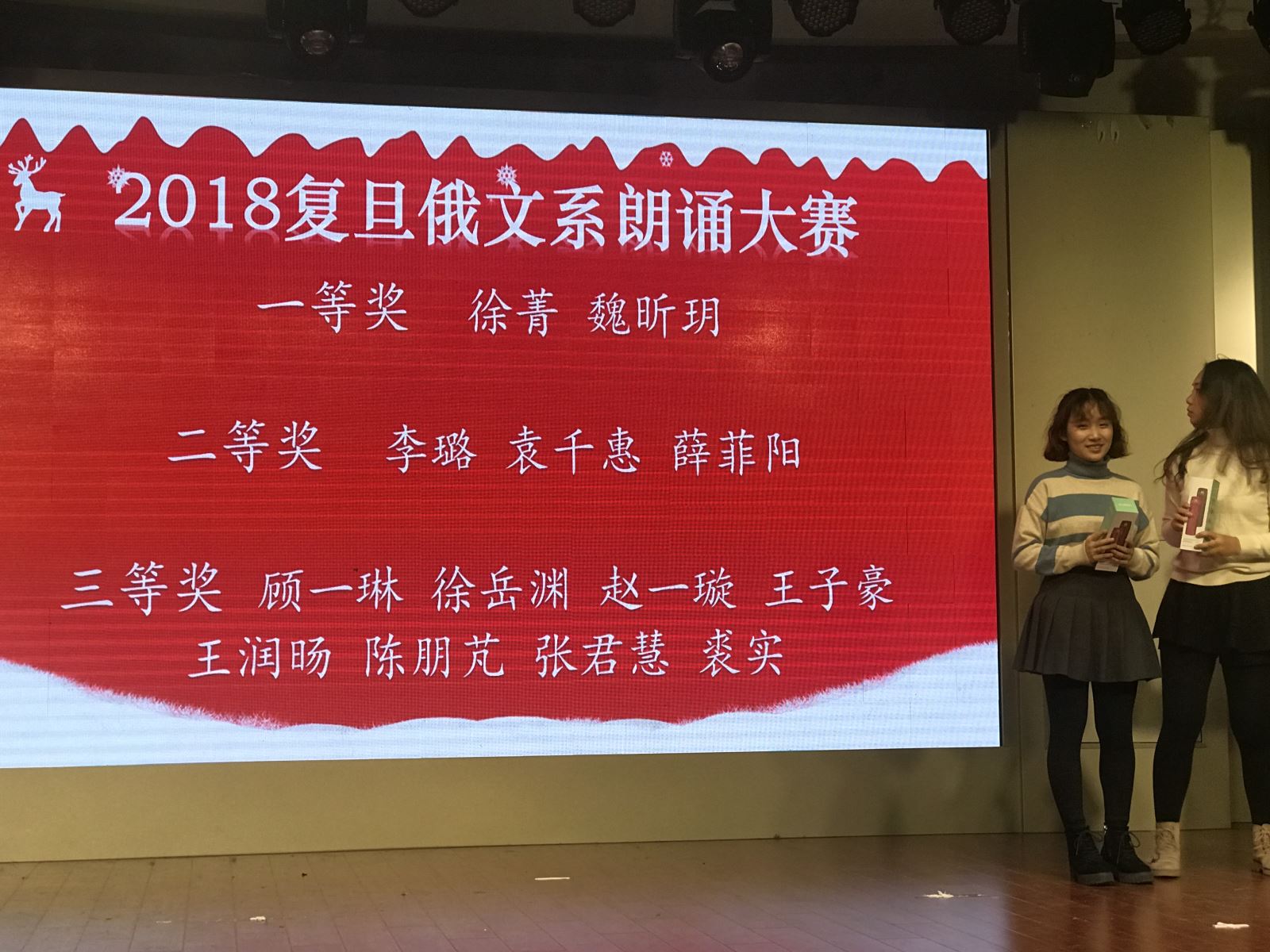 晚会中场举行了隆重的颁奖典礼,为在俄语朗诵大赛和书写大赛中均表现出色的俄文系同学授予奖项。