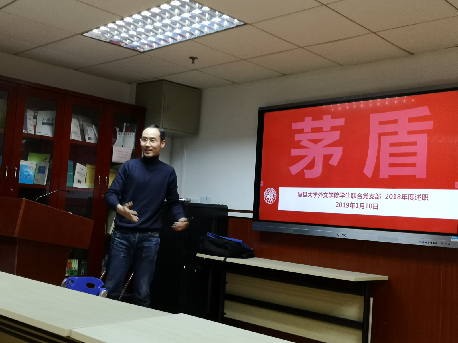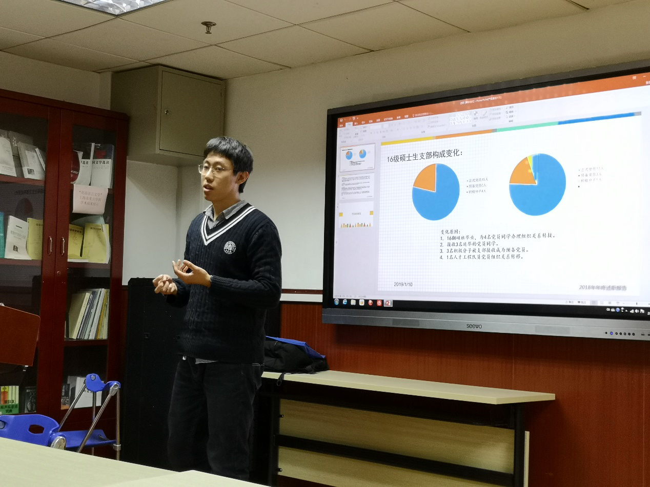 2019年1月10日下午, 丝瓜 学生党总支在文科楼424会议室举行学生党支部书记年度述职会。 丝瓜 党委书记罗英华,党委副书记、学生党总支书记赵昕,学生党总支副书记王亚鹏、茅盾,学生党支部书记、部分辅导员等参加述职会。