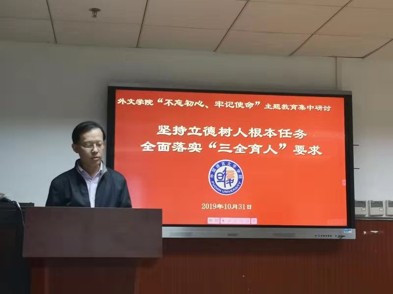 罗英华做总结发言,她表示,要自觉贯彻落实新时代党的教育方针,准确把握“为党育人、为国育才”的内涵,围绕“培养什么人、怎样培养人、为谁培养人”这一根本问题,坚持立德树人的根本任务,深入推进“三全育人”。结合主题教育活动中的调研情况,她分析了目前学院在落实“三全育人”方面的若干问题,指出要在几个方面下功夫。一是做强课堂主渠道,在提高教学质量上下功夫。优化课程设置,激励推动课程思政建设,打造“金课”,发挥课程的育人功能。二是以学生为中心,在促进学生成才上下功夫。改革研究生培养体系,提升实践育人能级,扩大实践项目的覆盖面和育人效果,建立机制加强师生互动。三是加强师德师风建设,在提高教师育人意识和能力上下功夫。抓实教职工政治理论学习,注重教师社会实践,选树先进典型,搭建老教师传帮带平台。四是提高管理能力,在加强服务支撑上下功夫。加强行政管理服务,树立服务师生、创先争优意识,改进工作流程,提高工作效率,实现管理育人。
