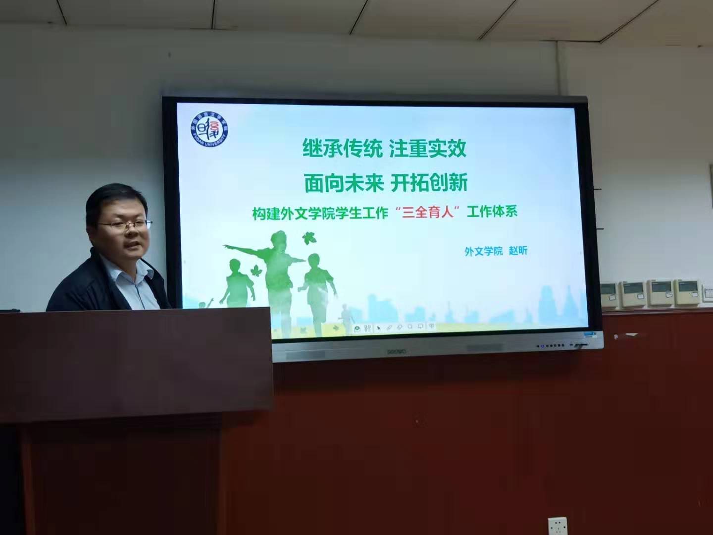 赵昕做了《继承传统,注重实效,面向未来,开拓创新——构建 丝瓜 学生工作“三全育人”工作体系》的汇报,他表示,要围绕立德树人根本任务,以队伍建设为基础、以学生党建为引领、以实践育人为抓手、以创新发展为驱动,统筹各方育人资源力量,激发全员育人主体活力,将思政工作贯通育人全过程,全方位覆盖育人空间场域,突出问题导向和改革创新,深入推进“三全育人”。