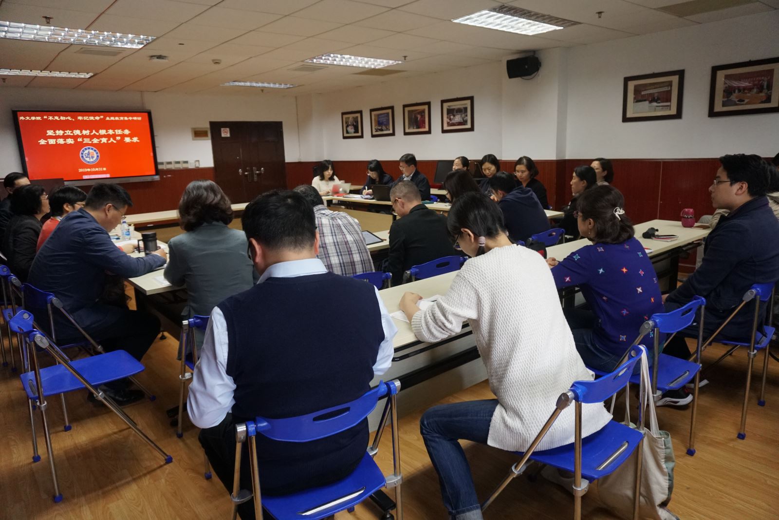 10月31日下午, 丝瓜 党政领导班子举行“不忘初心、牢记使命”第五次集中研讨学习,党委书记罗英华主持学习,校党委第五巡回指导组组长张宏莲、联络员邵田到会指导,学院各系、部负责人列席了会议。大家围绕“坚持立德树人根本任务,全面落实‘三全育人’要求”主题,在重点学习《习近平总书记关于教育的重要论述摘编》、习近平总书记在全国教育大会、全国高校思想政治工作会议、学校思想政治理论课教师座谈会和北京大学师生座谈会上的重要讲话精神的基础上,聚焦宗旨性质和担当作为、落实立德树人根本任务、加快推进“三全育人”进行了交流研讨。