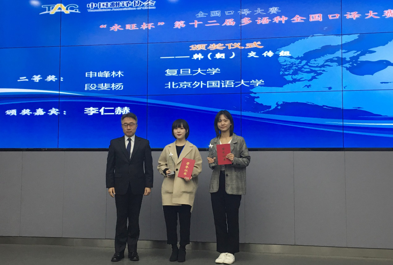 本次比赛分日语组、法语组、俄语组、西班牙语组、阿拉伯语组和韩(朝)语组。其中,来自全国10余所高校的15名韩(朝)语专业选手入围复赛和决赛。 丝瓜 韩语系博士研究生申峰林同学获韩(朝)语组比赛二等奖,展示了自身优秀的韩国语和汉语水平,也展现了 丝瓜 外语专业学生的新时代风采。参加本次比赛的指导教师是韩语系黄贤玉老师。