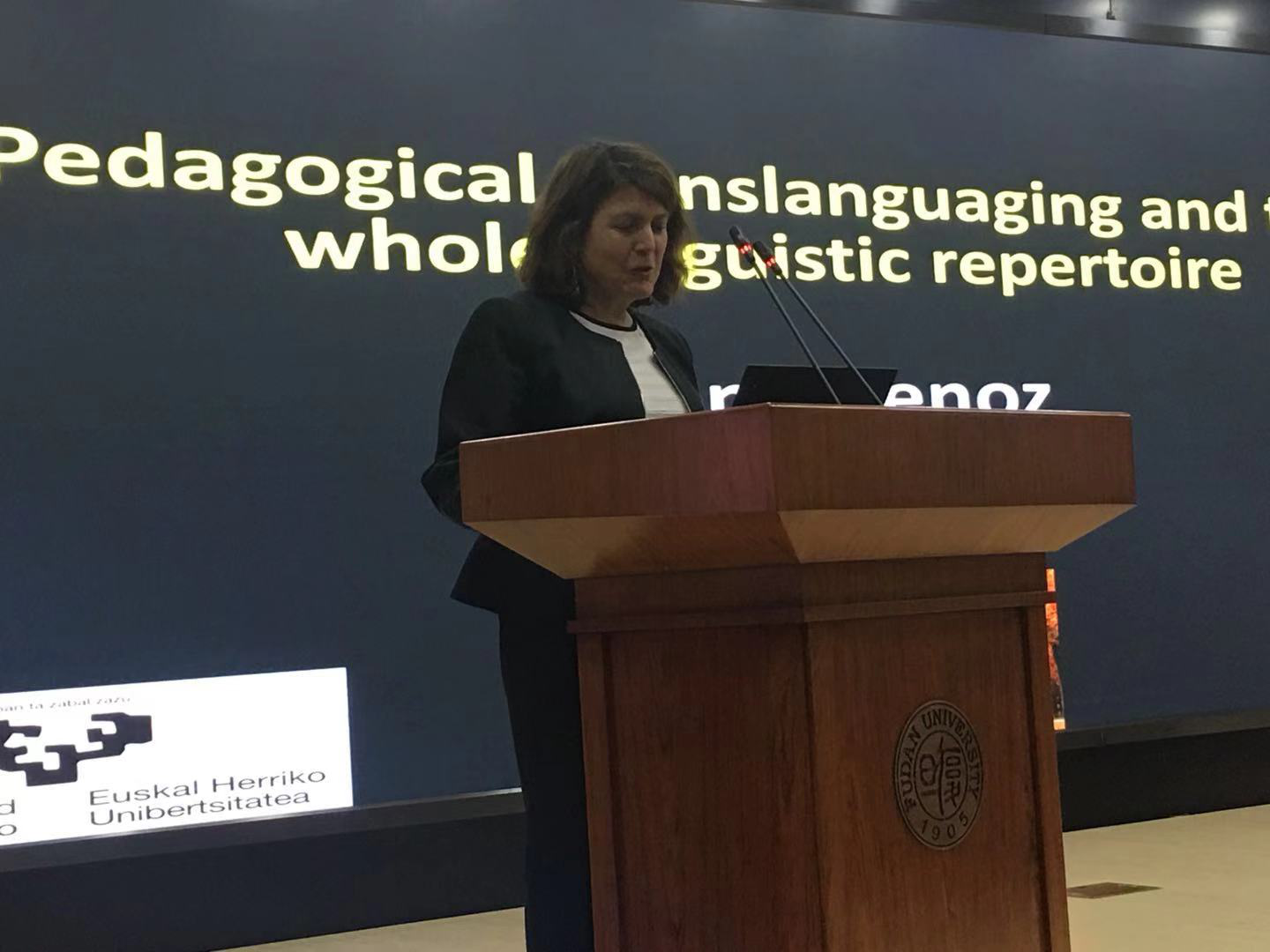 下午第一场主旨演讲人是西班牙巴斯克大学的Jasone Cenoz教授。Cenoz教授在跨语言研究方面享有国际盛誉,本次演讲她分享了研究团队在教学型超语实践(pedagogical translanguaging)方面的研究心得,尤其探讨了在多语言课堂如何最大化利用学生的多语言库存,打破单个语言系统的割裂而建立一个多语互通的新范式。第二场演讲是来自新西兰奥克兰大学的Lawrence Jun Zhang教授,他从个人在新加坡和新西兰两个国家的学习、教学经历切入,图文并茂地讨论了两个国家的多语教育政策,指出语言教育政策的实施与国家战略实施、人才培养愿景的互动关系。最后一场是 丝瓜 丝瓜 郑咏滟教授带来的讲座。她基于 丝瓜 正在实施的多语教育项目,讨论了中国大学生在学习英语之后第二外语学习的动机类型,学习不同二外的动机差异,以及长期追踪范式下的动机变化。她指出,在中国现有环境下推进多外语教育必须充分思考英语的“守门人”地位,如何利用学生现有的英语资源而推进多外语教育值得中国外语教育工作者的思考和探索。
