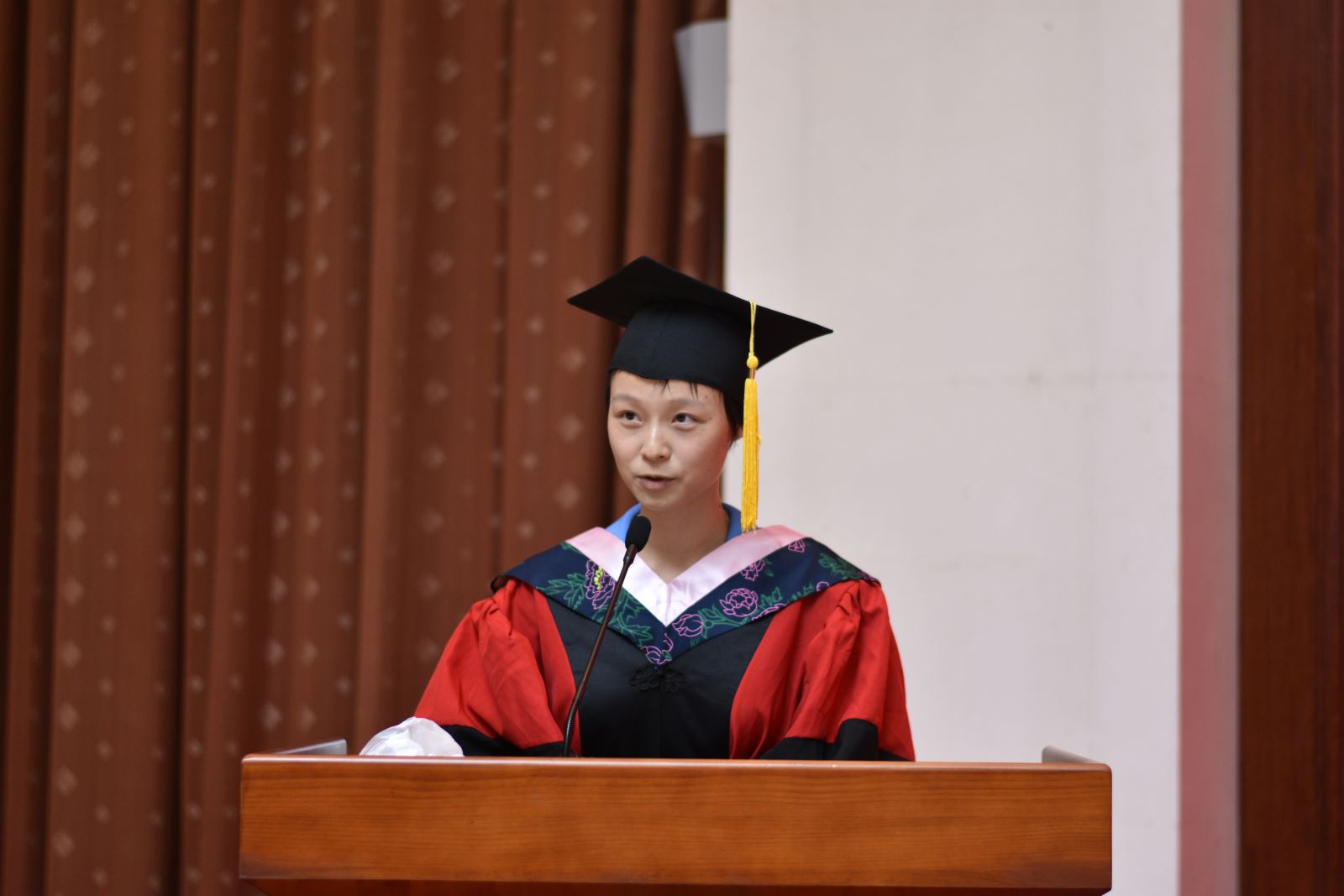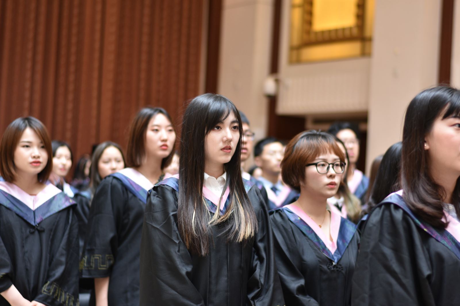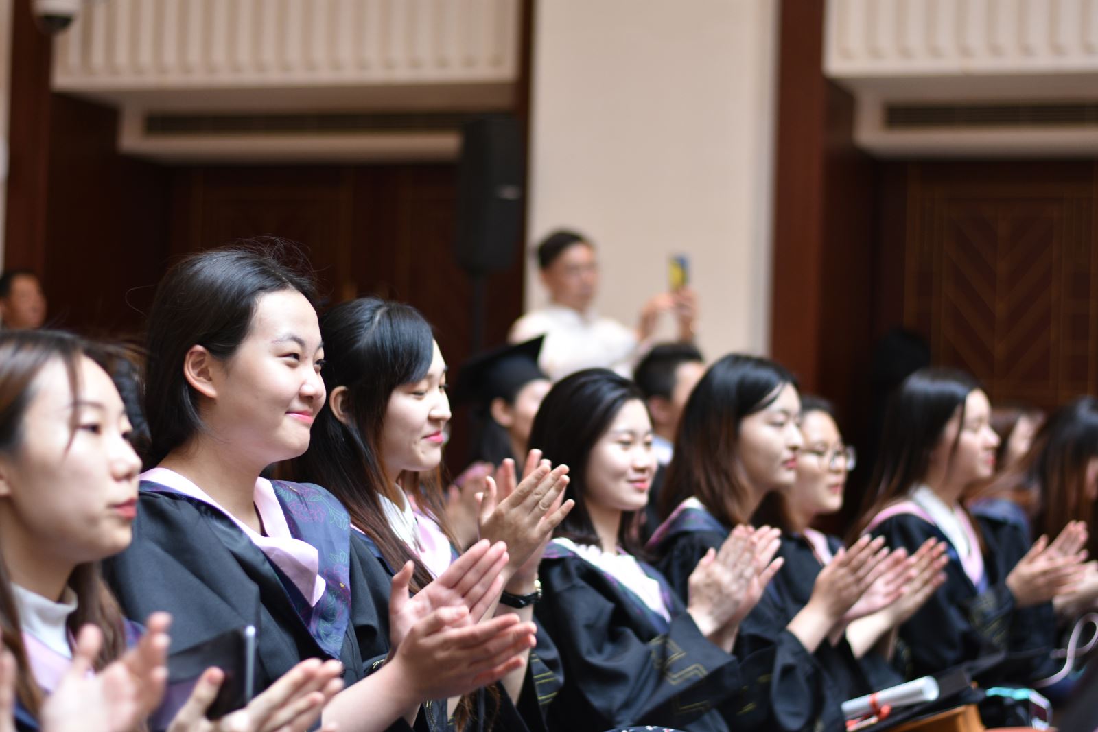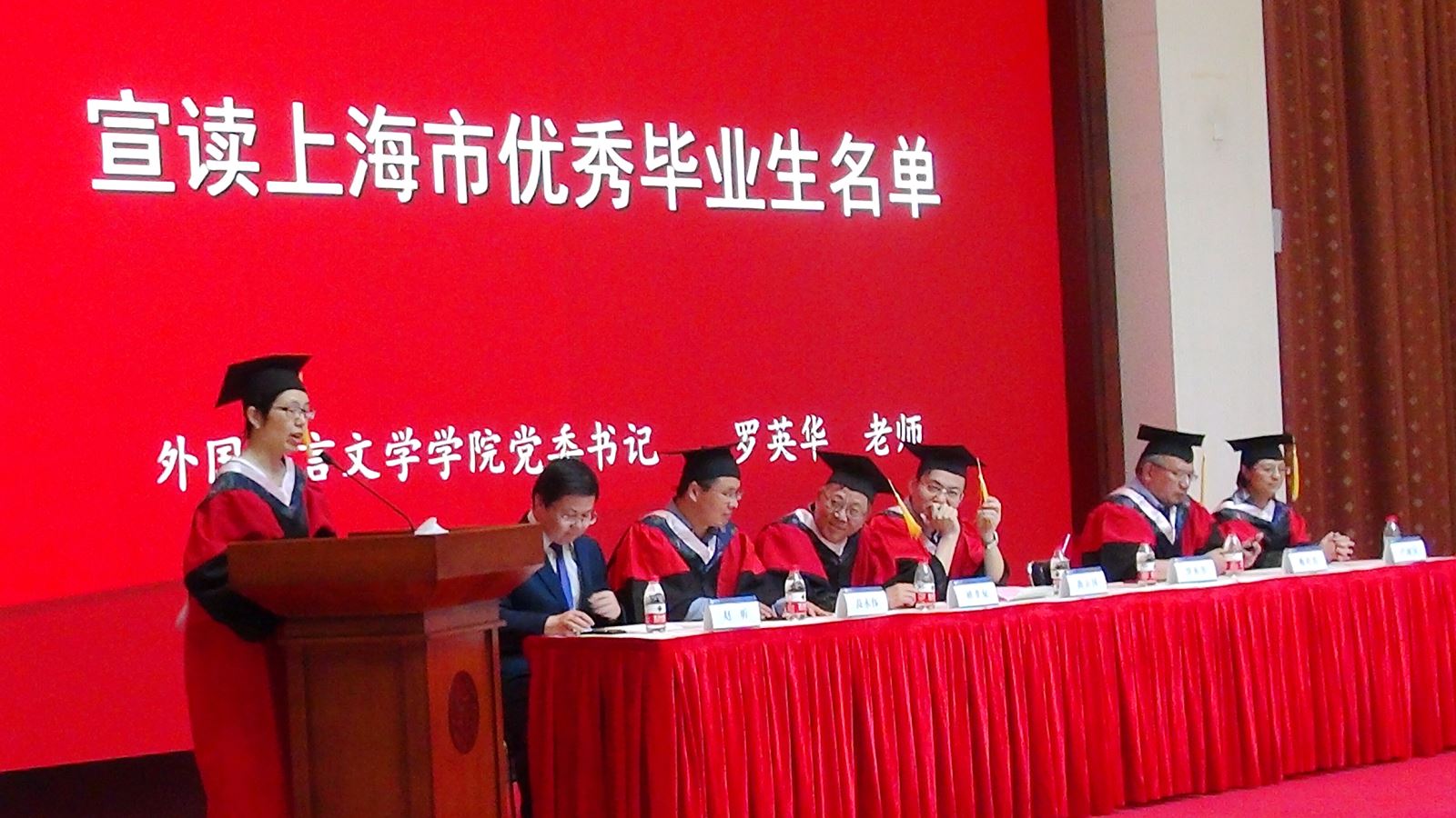 学位授予仪式上,英文系系主任朱建新老师、俄文系系主任姜宏老师、德文系姜林静老师、法文系系主任袁莉老师、日文系系主任邹波老师、韩文系系主任黄贤玉老师、翻译系王炎强老师依次上台宣读毕业生名单。