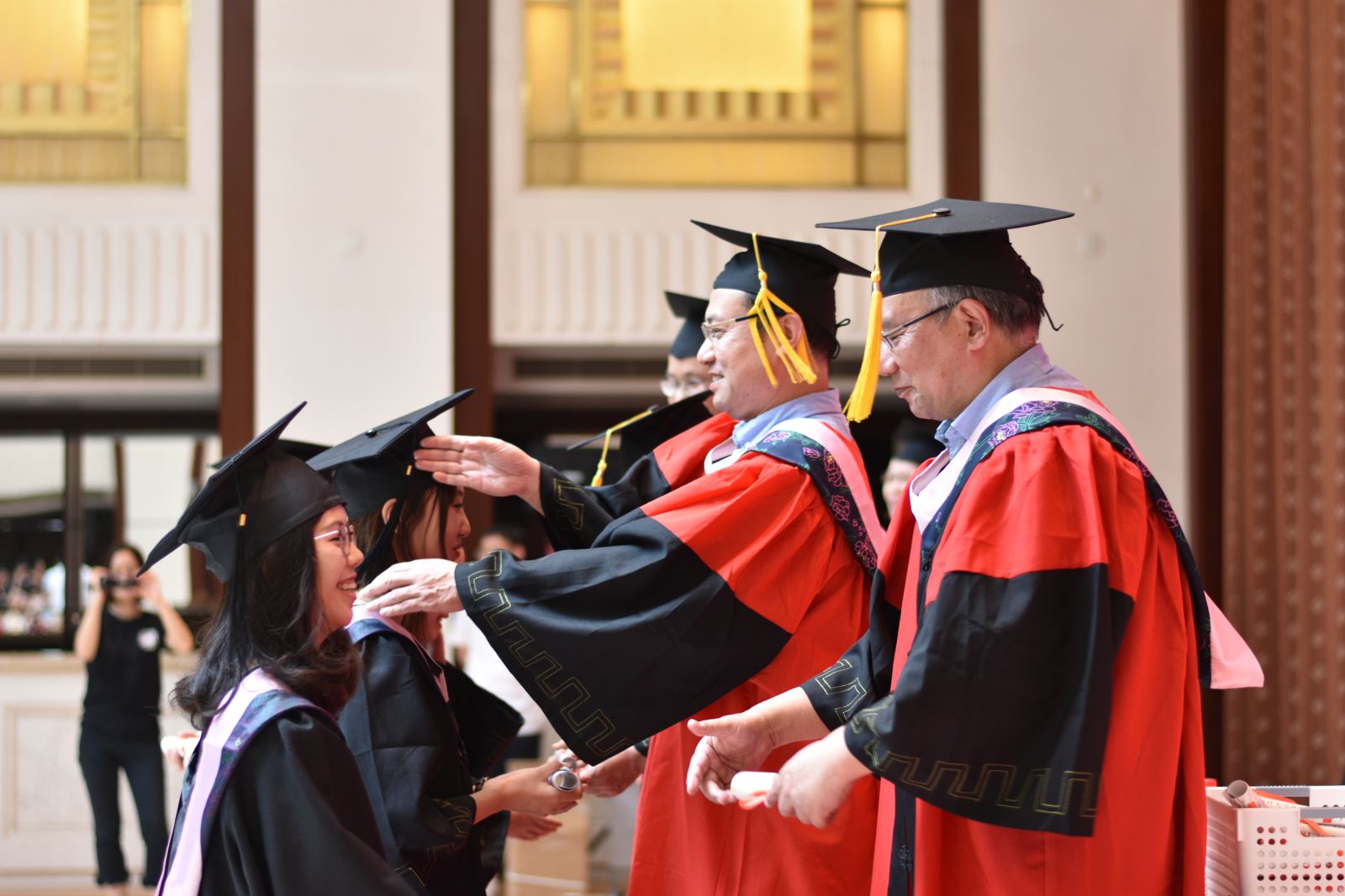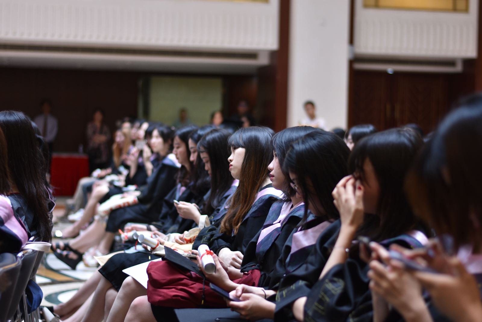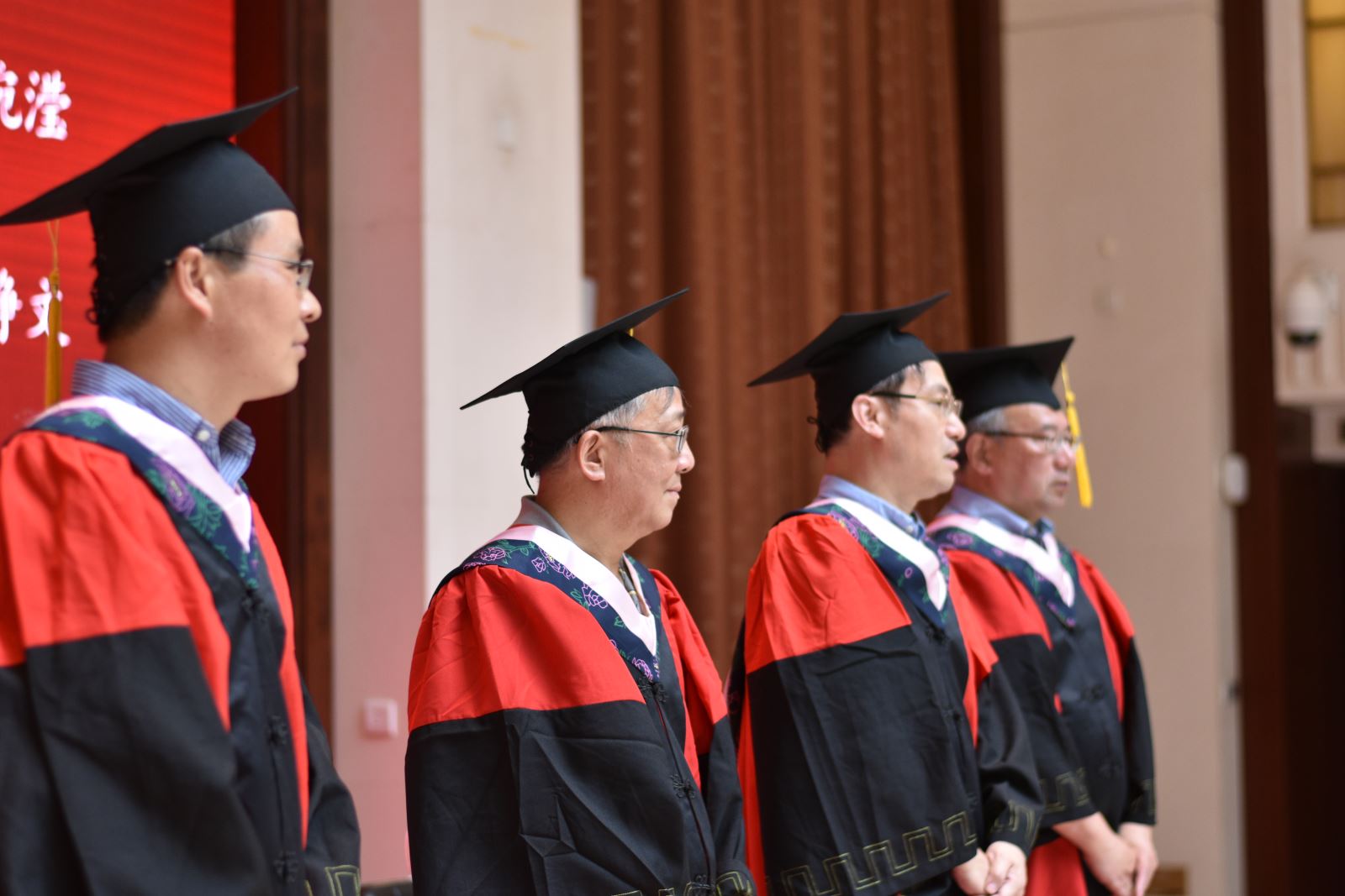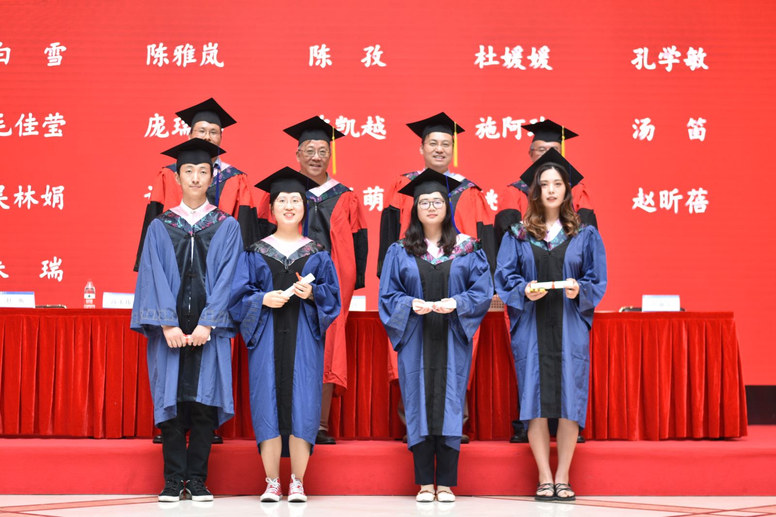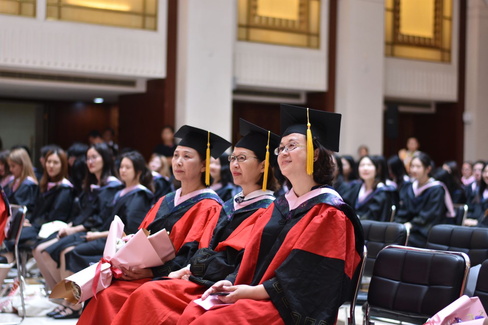 学位授予仪式上,英文系系主任朱建新老师、俄文系系主任姜宏老师、德文系姜林静老师、法文系系主任袁莉老师、日文系系主任邹波老师、韩文系系主任黄贤玉老师、翻译系王炎强老师依次上台宣读毕业生名单。