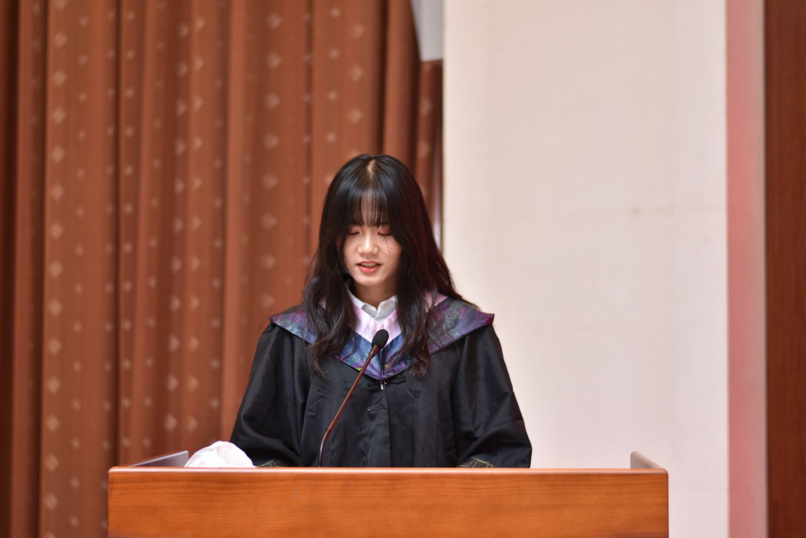 优秀本科毕业生代表、2019届英文系本科生喻子滢,优秀研究生毕业生代表、2019届日文系博士研究生朱田云先后发言,回顾了在复旦的点点滴滴,表达了对青春岁月的不舍、对学院和师长的感恩和对美好未来的憧憬。