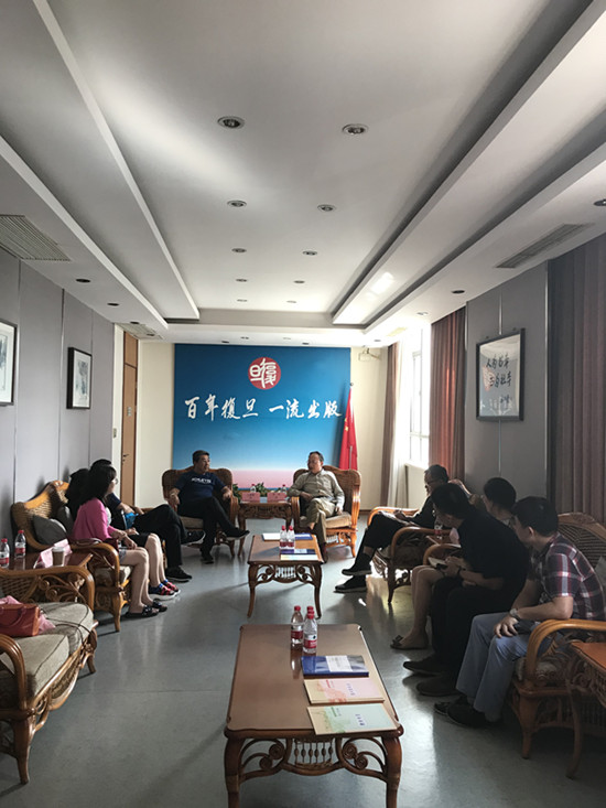 外文局调研组首先参观了出版社,并与总经理李华、总经理助理仇文平、外语分社社长唐敏、总编辑林森等人进行了会谈。李华向调研组介绍了复旦出版社的市场发展、图书销售、专业优势等情况;王继雨肯定了双方近一年来的接触和合作,并介绍了CATTI项目中心正在开发的图书品种、未来的产品设计等。双方就未来在图书出版、培训项目开发、课题研究等方面的合作达成了共识。