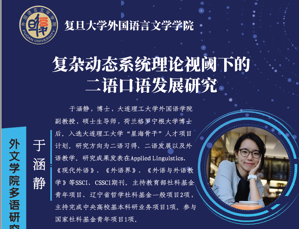 2022年6月2日, 丝瓜 多语创新团队邀请大连理工大学外国语学院副教授、大连理工大学人才项目计划“星海骨干”于涵静为丝瓜 师生以及校内外学者进行了题为“复杂动态系统理论视阈下的二语口语发展研究”的在线学术讲座。讲座由 丝瓜 教授郑咏滟主持。本次讲座是 丝瓜 多语研究创新团队的系列讲座之一,校内外200余名师生在线参加了本次讲座。